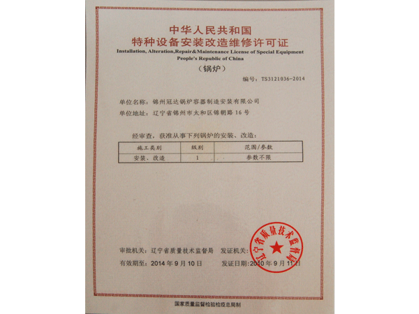 特種設(shè)備安裝改造維修許可證(鍋爐)